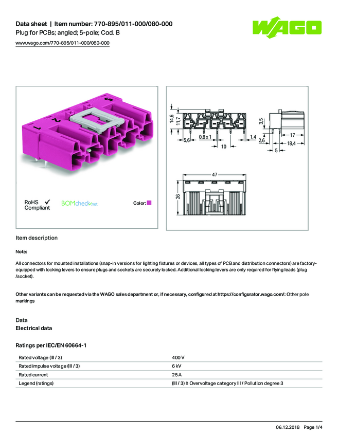 WAGO 770-294/081-000 Złącze męskie sieciowe WINSTA MIDI złącze męskie proste Łączna ilość styków: 4 25 A różowy 50 szt.