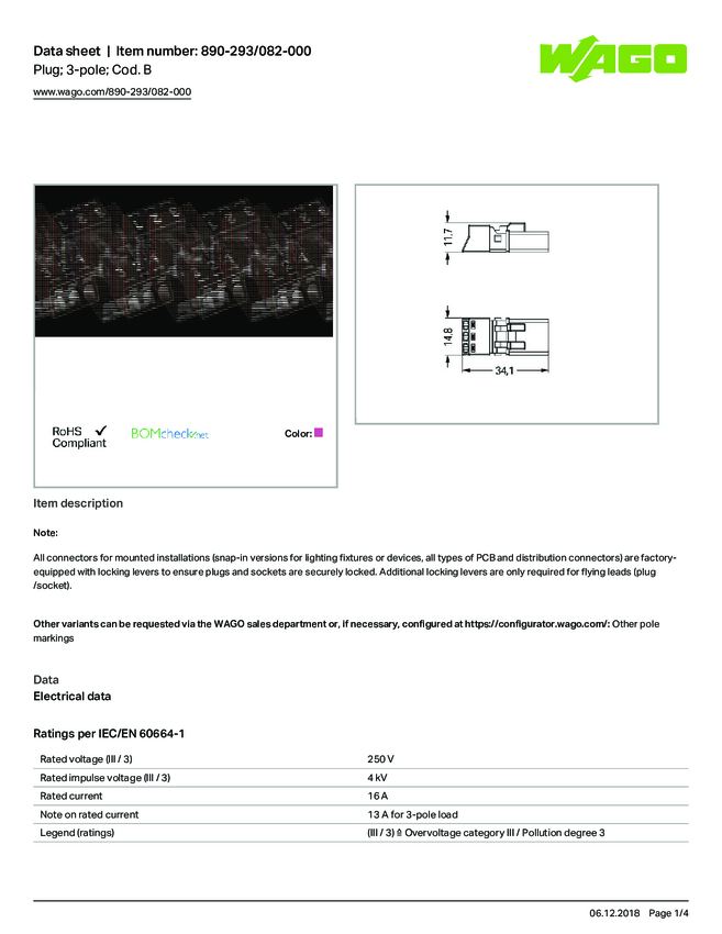 WAGO 890-293/082-000 Złącze męskie sieciowe WINSTA MINI, styki: 3, 250 V, 16 A, 50 szt.