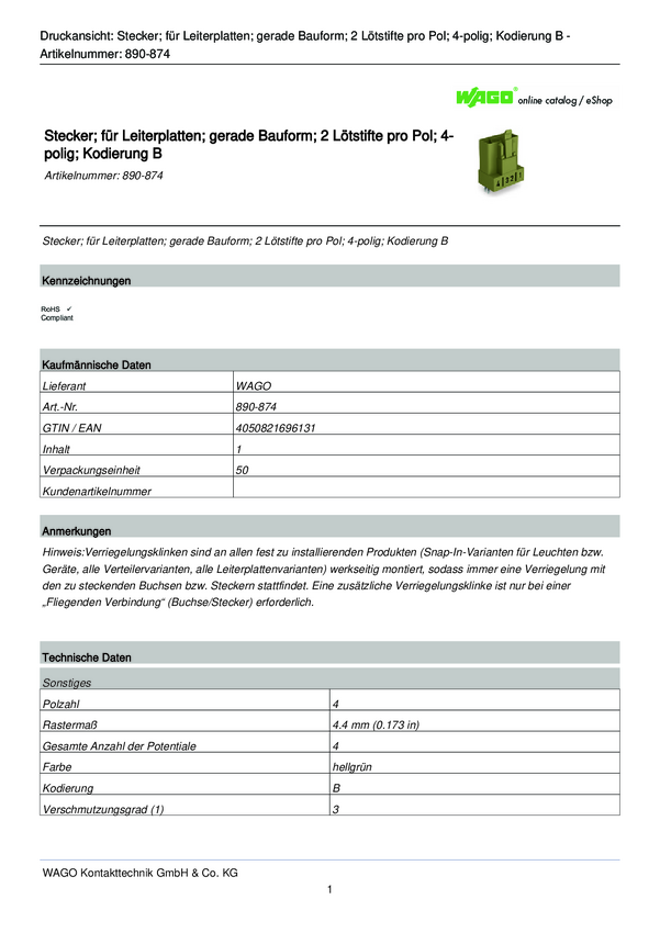 WAGO 890-874 Złącze męskie sieciowe WINSTA MINI, styki: 4, 400 V, 16 A, 50 szt.