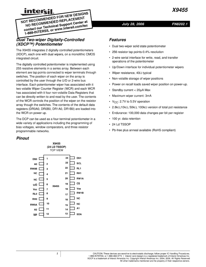 Dual Digitally Controlled Potentiometer (XDCP™); Low Noise, Low Power, SPI® Bus, 128 Taps, Wiper Only