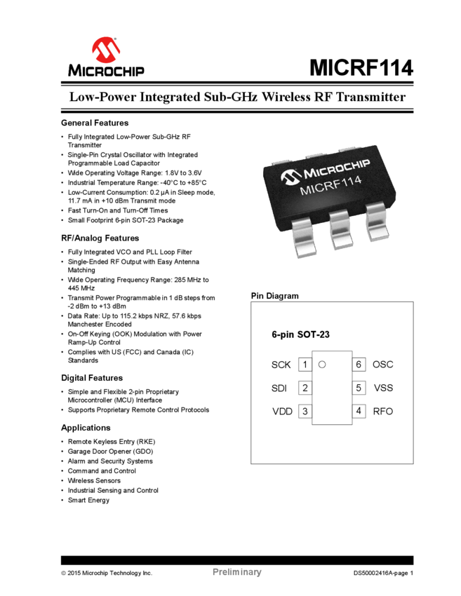 MICRF114 Low-Power Integrated Sub-GHz Wireless RF Transmitter Data Sheet (09/18/2015)