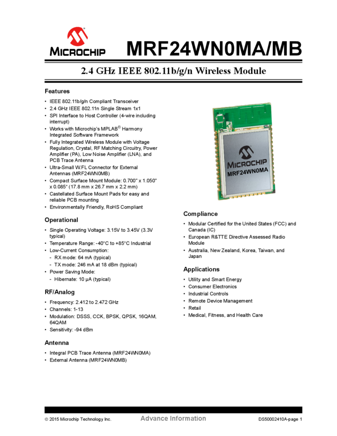 MRF24WN0MA/MB 2.4 GHz IEEE 802.11b/g/n Wireless Module Data Sheet (08/07/2015)