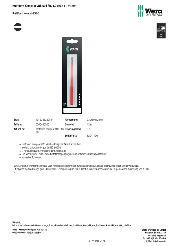 Wkrętak z wymiennymi końcówkami Wera KK 60 i 05004403001 płaski 4 mm