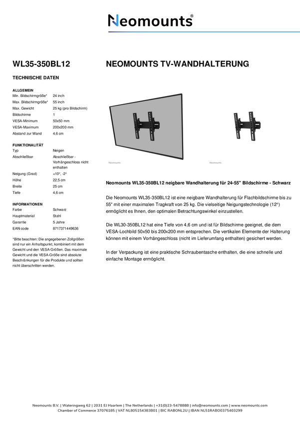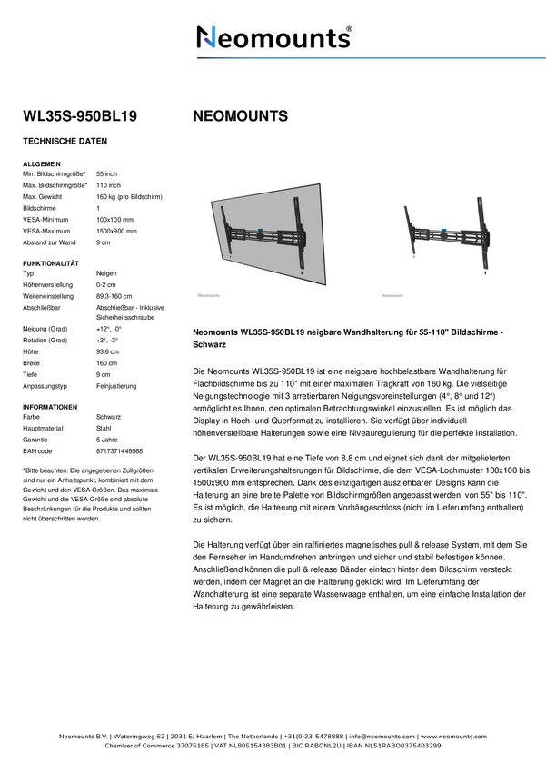 Uchwyt ścienny Neomounts WL35S-950BL19 o dużej wytrzymałości – ekran 55–110 cali – maks. 160 kg – VESA 100 x 100–1500 x