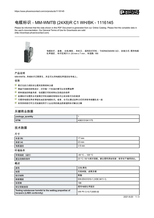 Drukarka systemu etykietującego Phoenix Contact MM-WMTB (24X8)R C1 WH/BK 1116145, montaż: opaska kablowa, 24 x 8 mm, 1 s