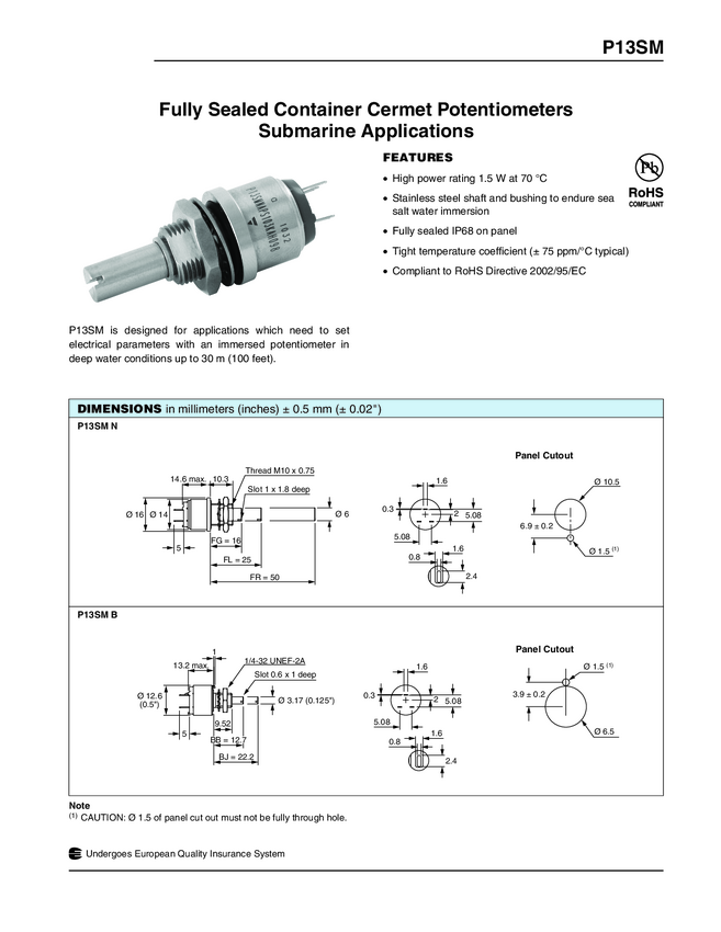 Potencjometr cermetowy IP68 ( zanurzeniowy-wodoodporny do 30 m) zdefiniowane jak w karcie katalogowej; 1 obrotowy moc 1,5W, 75ppm, średnica bębna 16mm; gł. 14,6mm+ piny z tył u 5mm; ośka 50mm śr. 6mm; Bushing m10x0,75; Rezystancja 1k