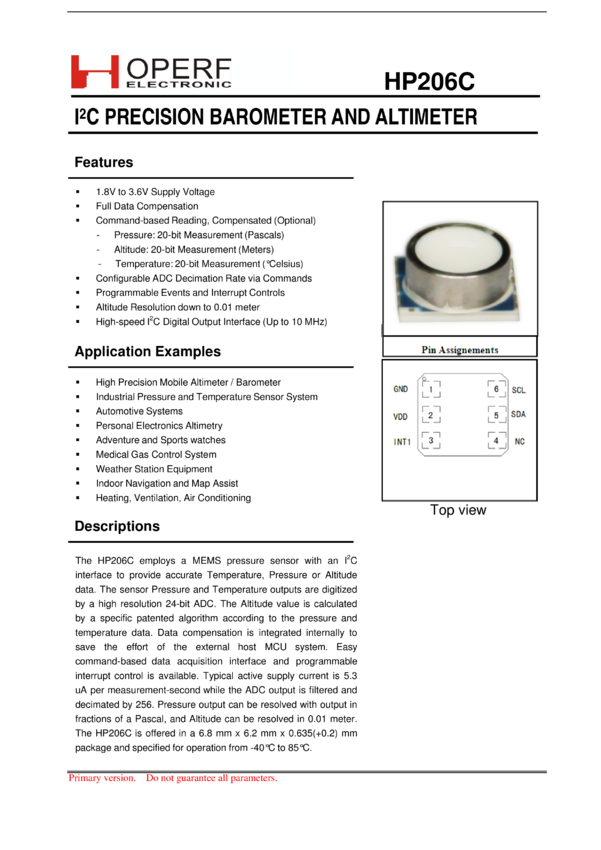 Precyzyjny, wodoodporny czujnik barometryczny lub wysokości, 20 bitowy przetwornik A/C, możliwość pomiaru temperatury;