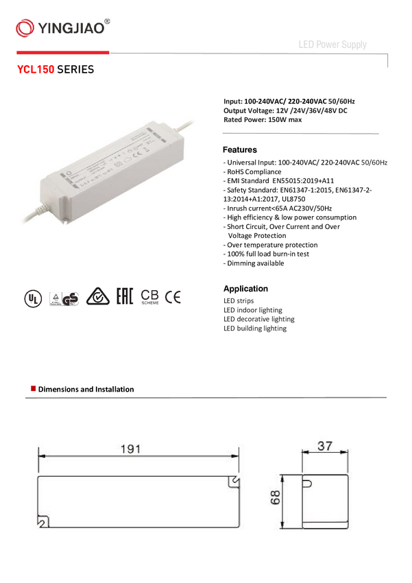 Zasilacz do oświetlenia LED 24V 6,25A 150W wodoszczelny IP67 YINGJIAO | YCL150-24006250
