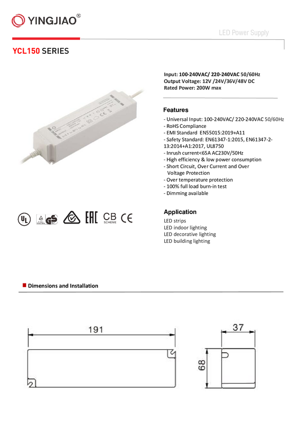 Zasilacz do oświetlenia LED 12V 16,6A 200W wodoszczelny IP67 YINGJIAO | YCL150-12016600