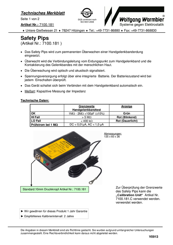 Wolfgang Warmbier 2250.790 Przewód uziemiający ESD 1.80 m przycisk 10 mm