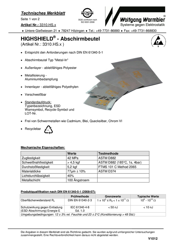 Woreczek ochronny ESD Highshield® 3310.HS.1014 Wolfgang Warmbier 3310.HS.1014 (D x S) 356 mm x 154 mm N/A Grubość materi