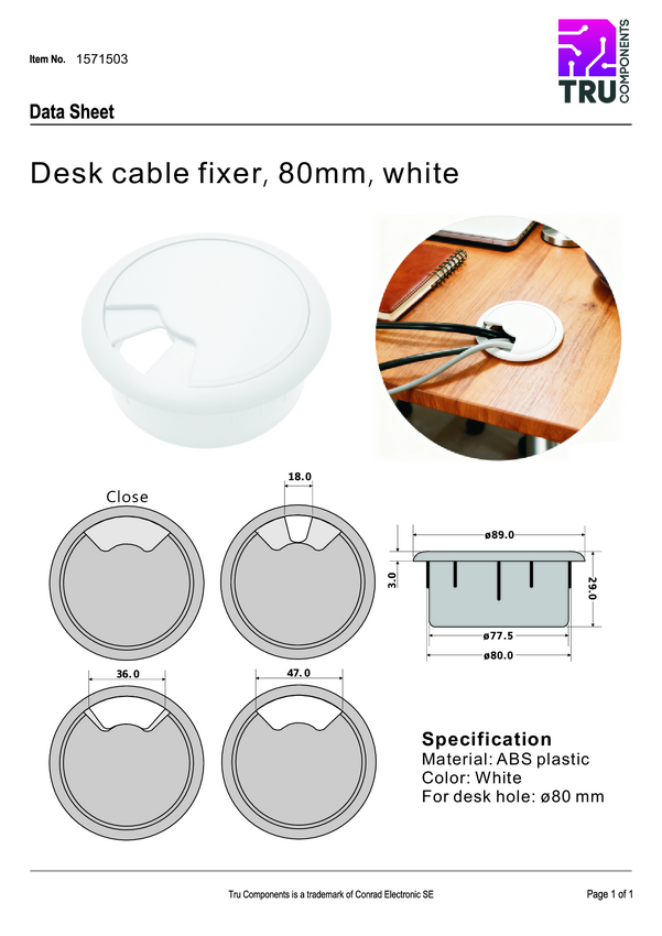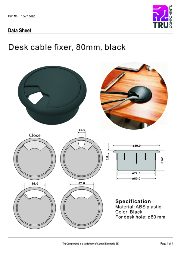 TRU COMPONENTS 452677-BK Przepust kablowy WP80BK, (Ø x W) 89 mm x 29.5 mm, ABS, 1 szt.