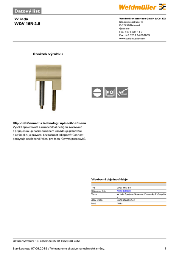Łącznik krzyżowy Weidmüller WQV 16N-2.5 1073100000, 10 szt.