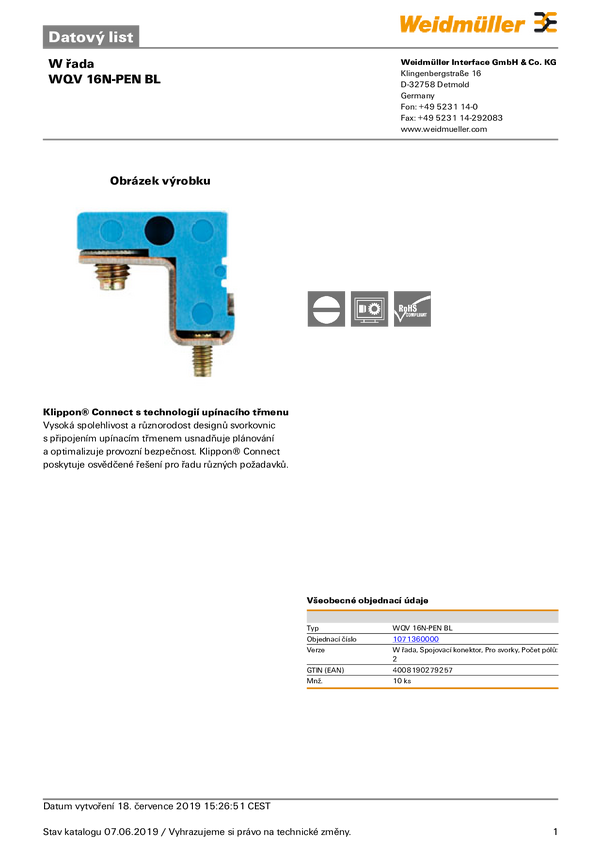 Łącznik krzyżowy Weidmüller WQV 16N-PEN BL 1071360000, 10 szt.