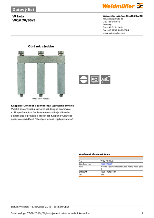 Łącznik krzyżowy Weidmüller WQV 70/95/3 1063600000, 5 szt.
