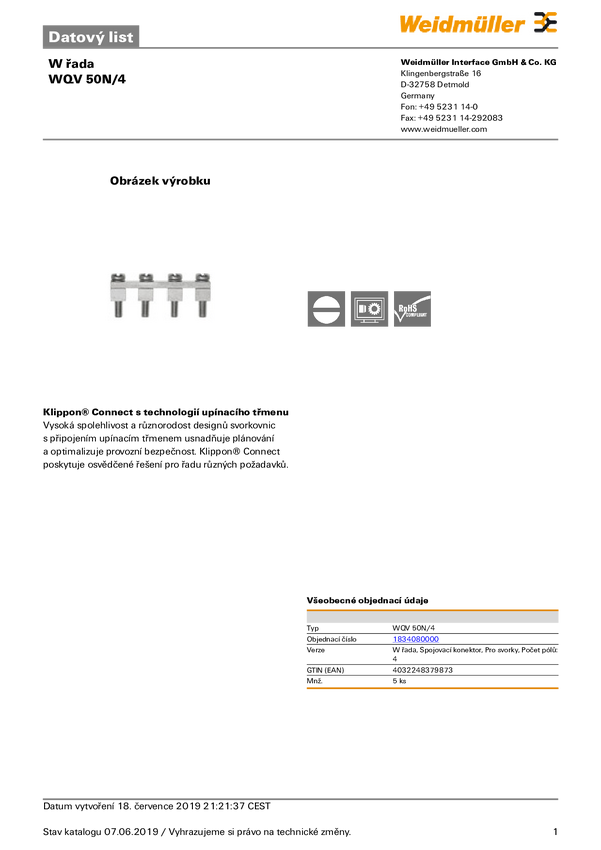 Łącznik krzyżowy Weidmüller WQV 50N/4 1834080000, 5 szt.