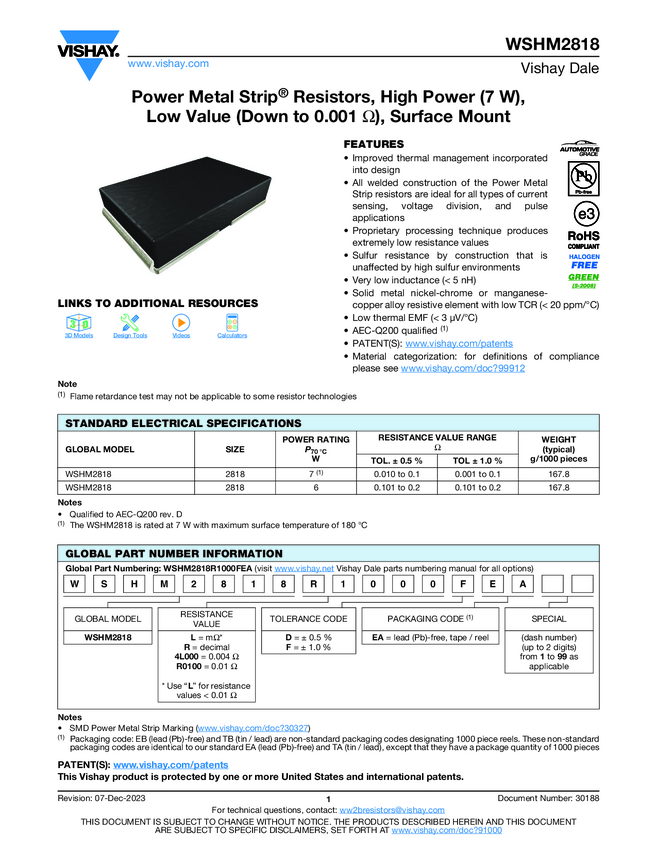 Power Metal Strip® Resistors, High Power (7 W), Low Value (Down to 0.001 Ω), Surface Mount