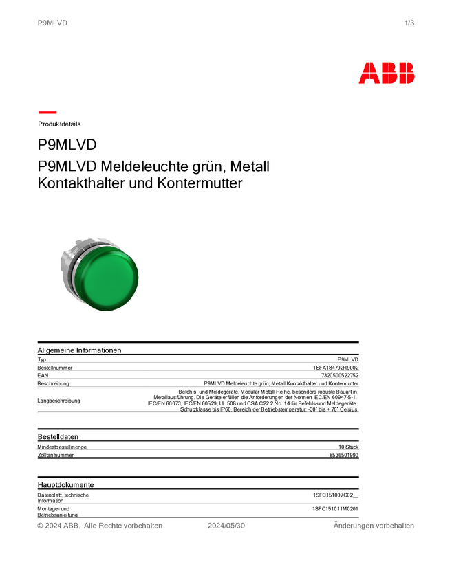 ABB P9MLVD Podświetlenie wskaźnika zielony 1 szt.