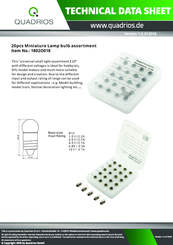Quadrios 1802O018 Żarówka wskaźnikowa 1.5 V, 2.5 V, 4.5 V, 4.8 V, 12 V Trzonek E10 20 części