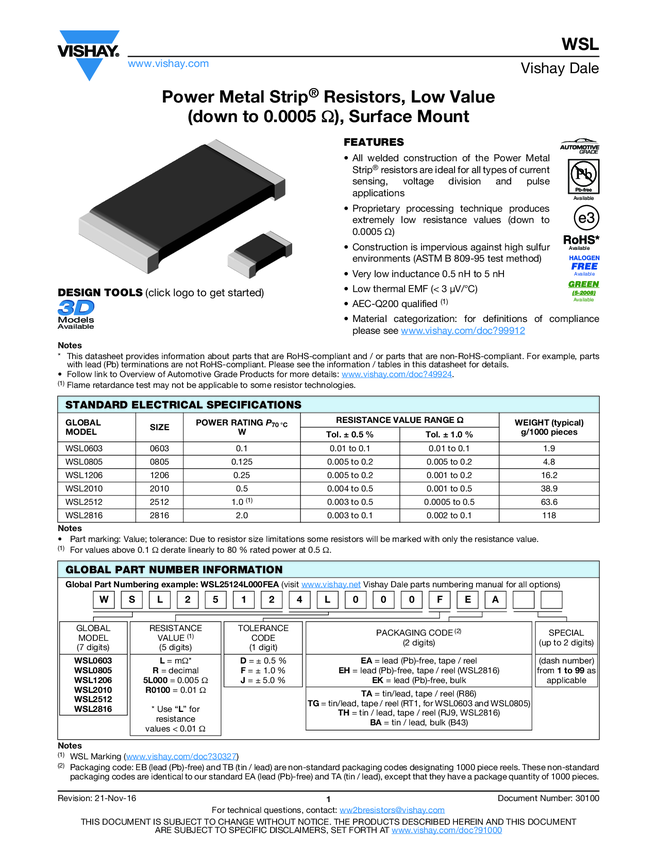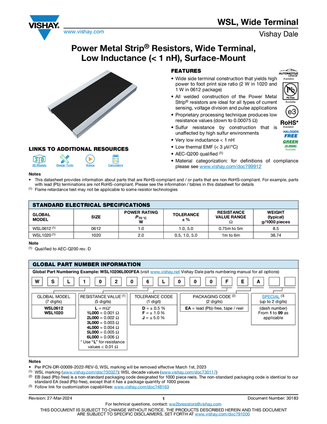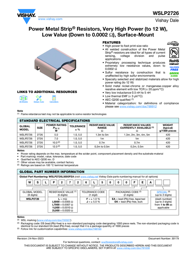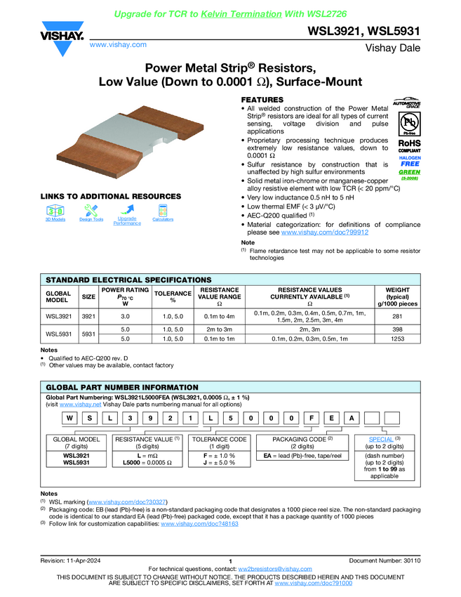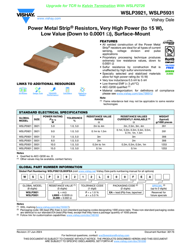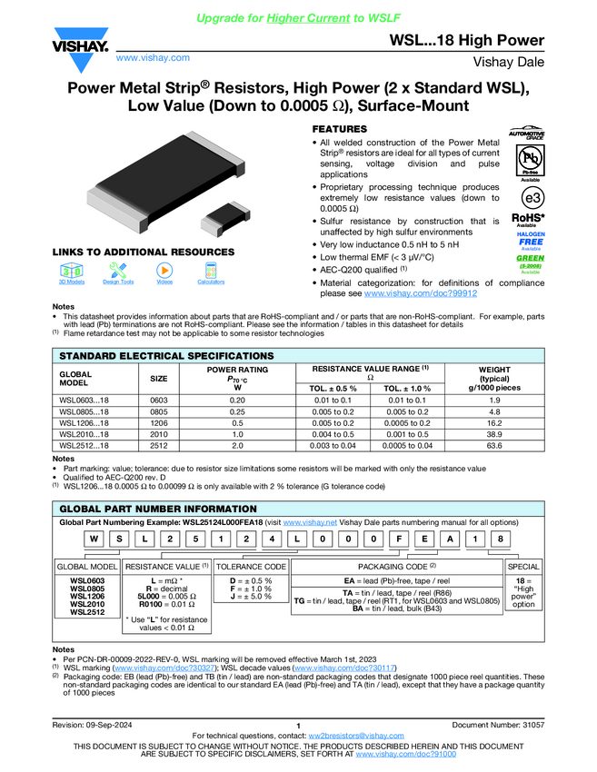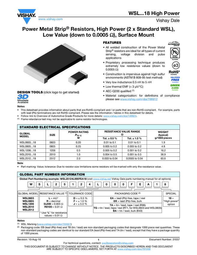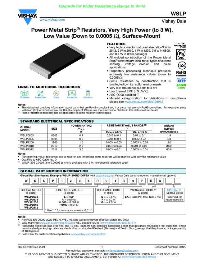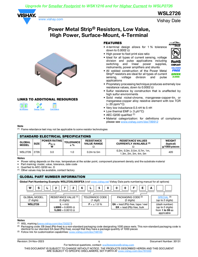 Power Metal Strip® Resistors, High Power (2 x Standard WSL), Low Value (Down to 0.0005 Ohm), Surface Mount