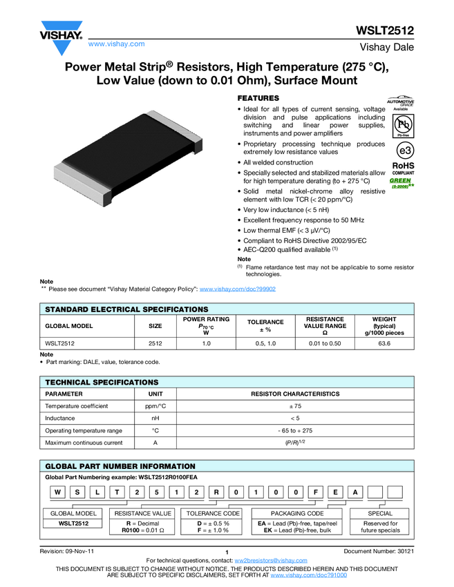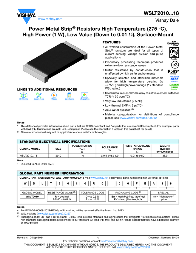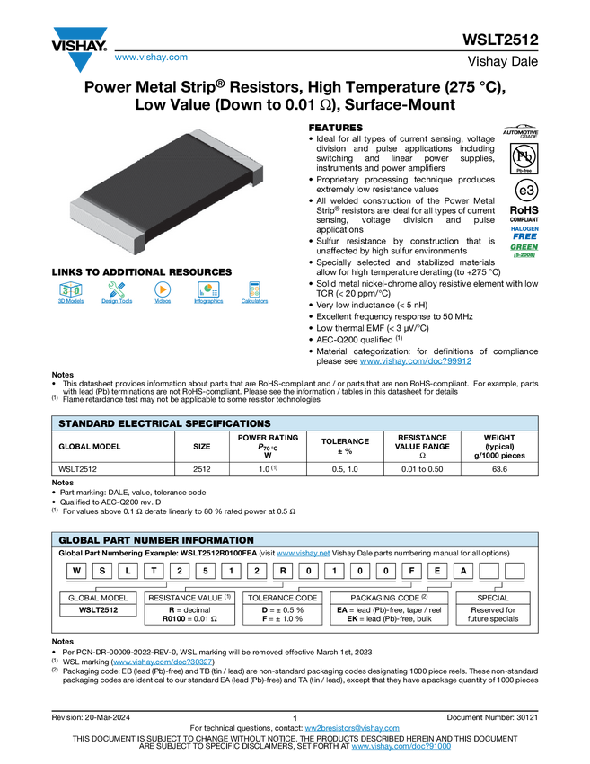 Power Metal Strip® Resistors High Temperature (275 °C), High Power (1 W), Low Value (Down to 0.01 Ohm), Surface-Mount