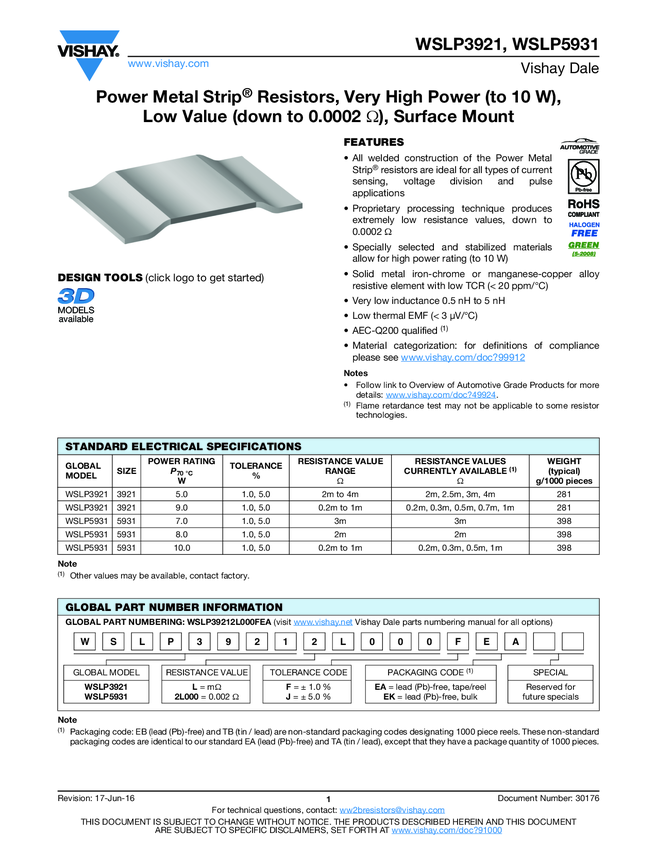 Power Metal Strip® Resistors, Very High Power (to 3 W), Low Value (Down to 0.0005 Ω), Surface-Mount