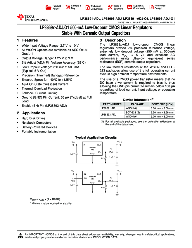 LDO Regulator Pos 1.25V to 9V 0.5A 6-Pin WSON T/R