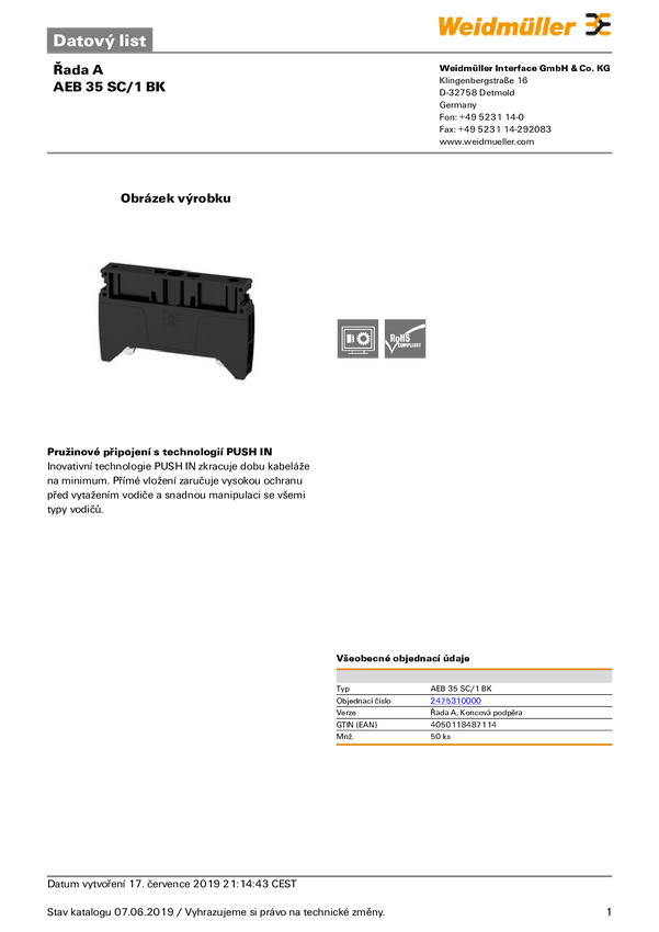Wspornik końcowy Weidmüller AEB 35 SC/1 BK 2475310000, 50 szt.