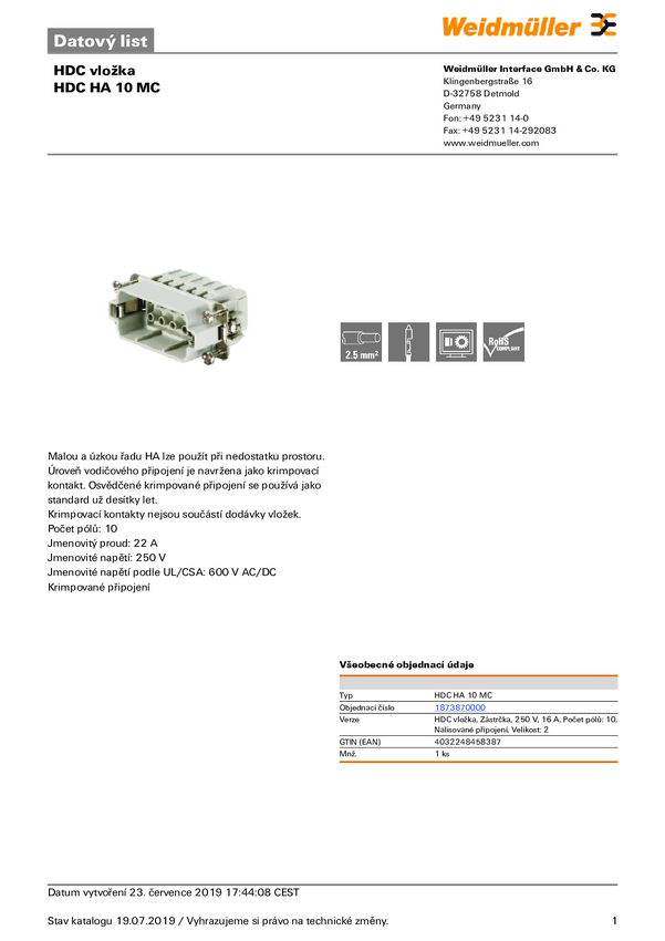 Weidmüller HDC HA 10 MC 1873870000 Wstawka pinowa męska 1 szt.