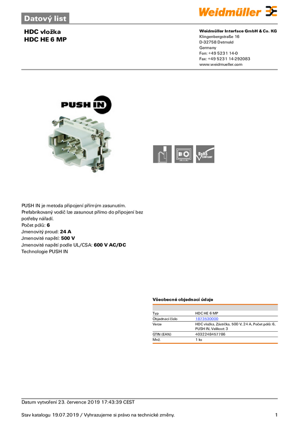 Weidmüller HDC HE 6 MP 1873530000 Wstawka pinowa męska 1 szt.