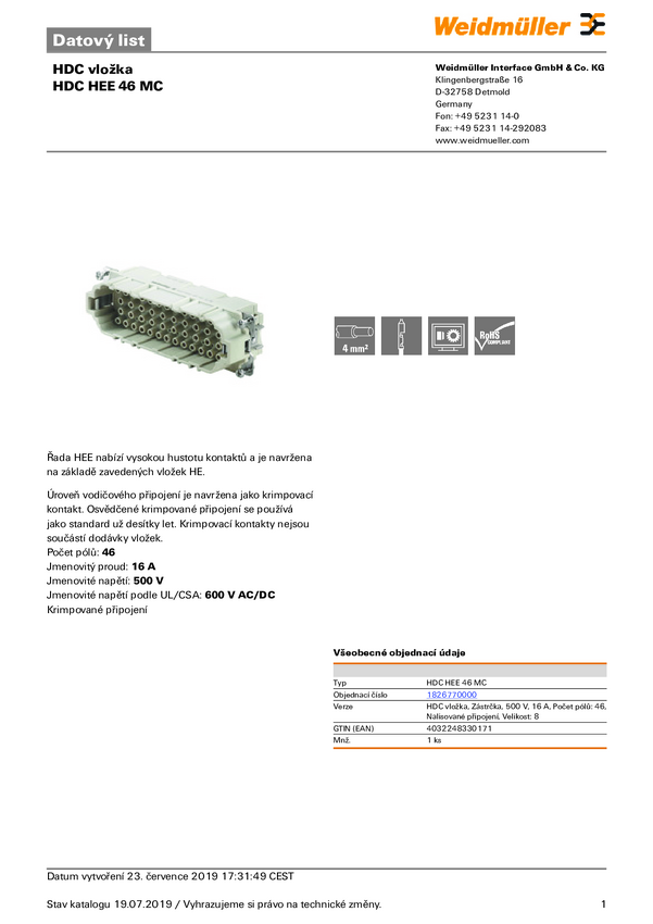 Weidmüller HDC HEE 46 MC 1826770000 Wstawka pinowa męska 1 szt.