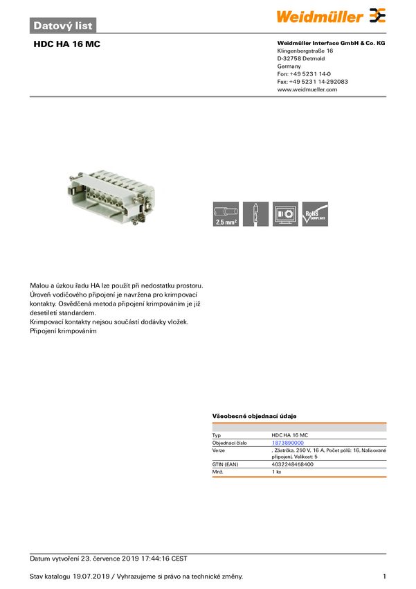 Weidmüller HDC HA 16 MC 1873890000 Wstawka pinowa męska 1 szt.