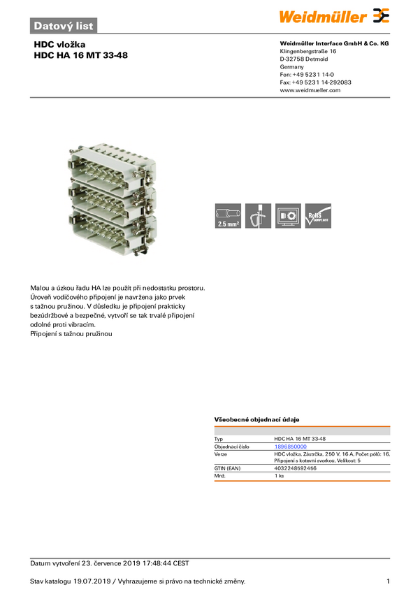 Weidmüller HDC HA 16 MT 17-32 1896840000 Wstawka pinowa męska 1 szt.