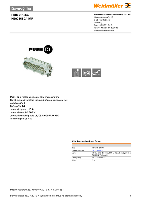 Weidmüller HDC HE 24 MP 1873590000 Wstawka pinowa męska 1 szt.