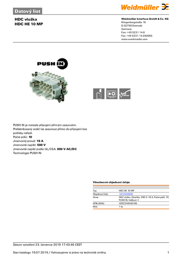 Weidmüller HDC HE 10 MP 1873550000 Wstawka pinowa męska 1 szt.