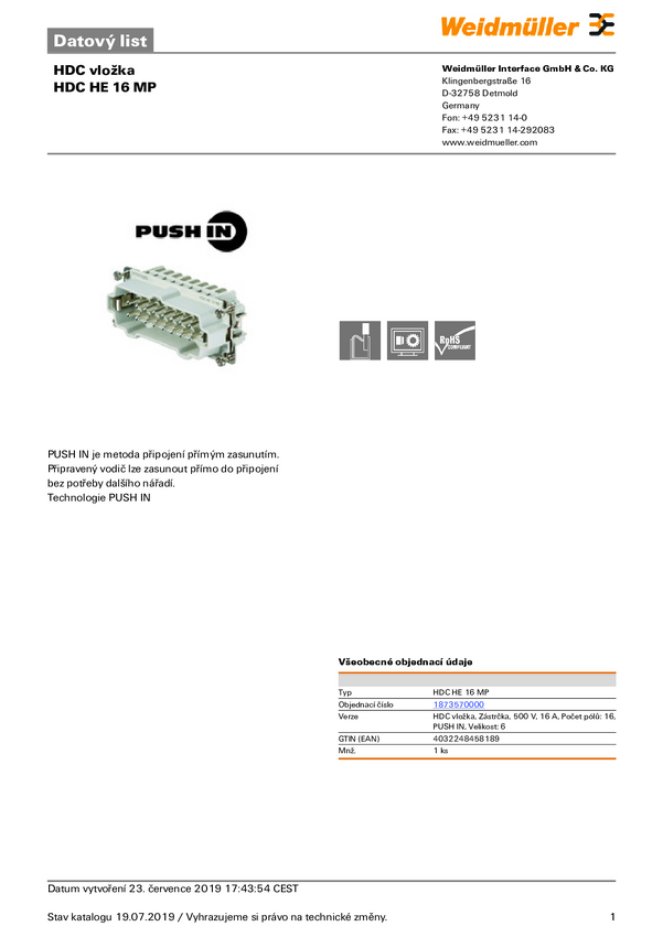 Weidmüller HDC HE 16 MP 1873570000 Wstawka pinowa męska 1 szt.