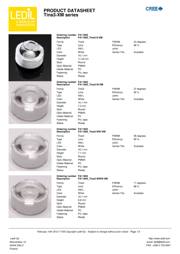 Soczewka TINA3-S 11905, Spot, śr: 16,3mm, wys: 7mm 23&deg, do wszystkich diod LED High Power CREE serii XM-L, XLAMP, Ledil