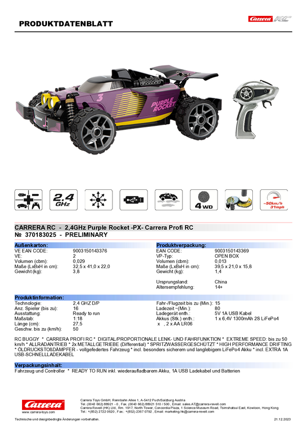 Carrera 370183025 Purple Rocket 1:18 Samochód RC dla początkujących Elektryczny Buggy Napęd na wszystkie koła