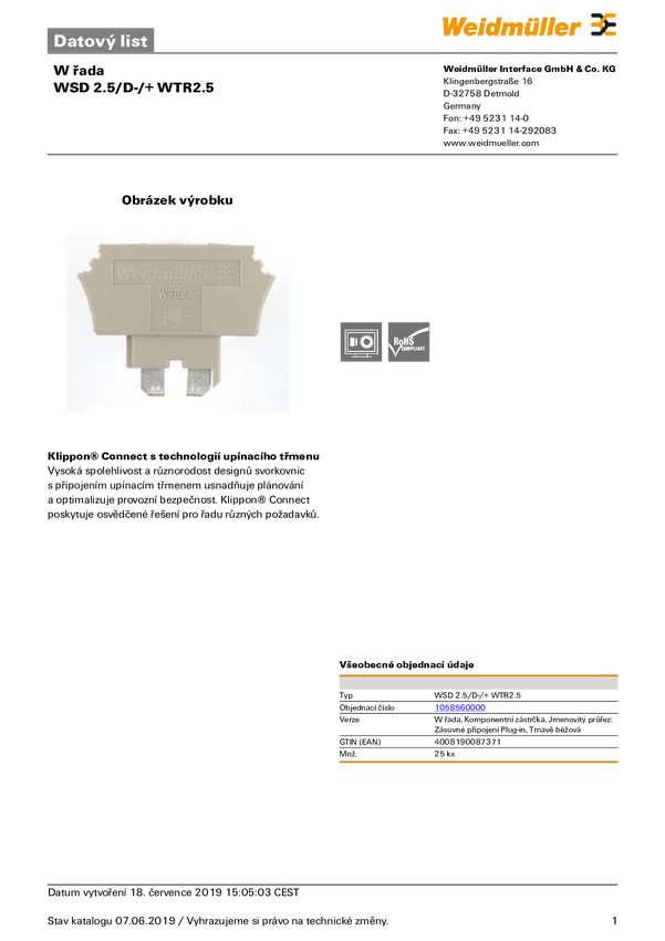 Element wtyczki Weidmüller WSD 2.5/D-/+ WTR2.5 1058560000, 25 szt.