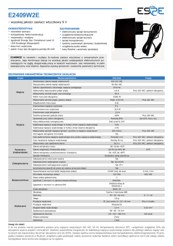 Zasilacz wtyczkowy ESPE 9V 2,5A 22,5W | E2409W2E