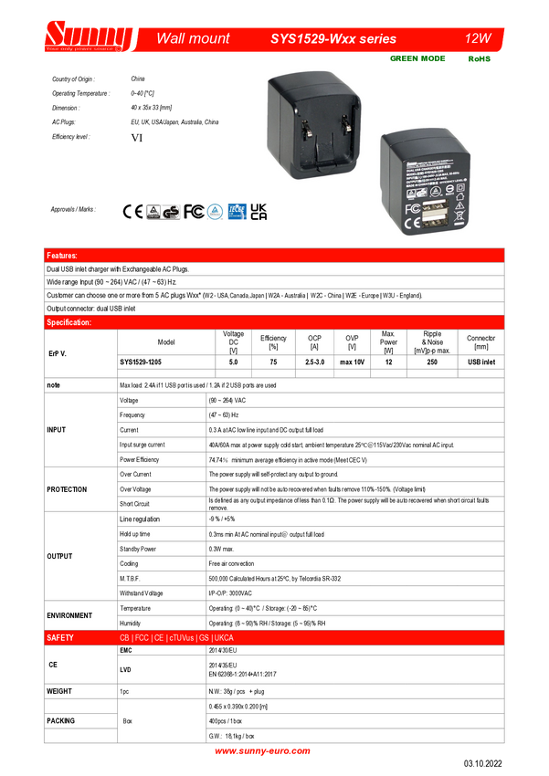 Zasilacz wtyczkowy SUNNY 24V 0,5A 12W | SYS1381N-1224-W2E