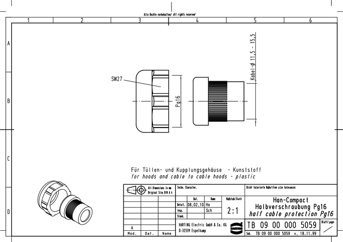 Półdławnica PG16 Do obudowy wtyczek i złączy Harting 09000005059 Zawartość: 1 szt.