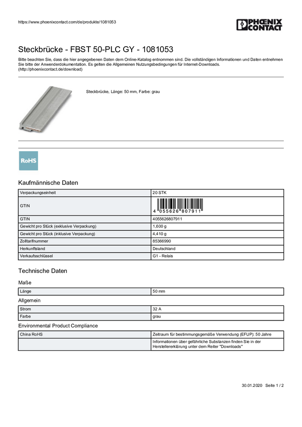 Mostek wtykany Phoenix Contact FBST 50-PLC GY 1081053, 20 szt.
