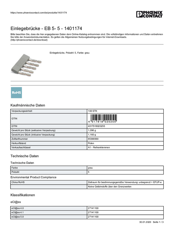 Mostek wtykany Phoenix Contact EB 5- 5 1401174, 100 szt.