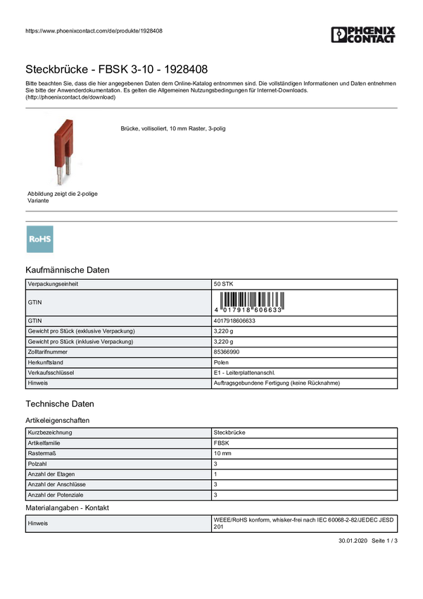 Phoenix Contact 1928408 Mostek wtykany 50 szt.