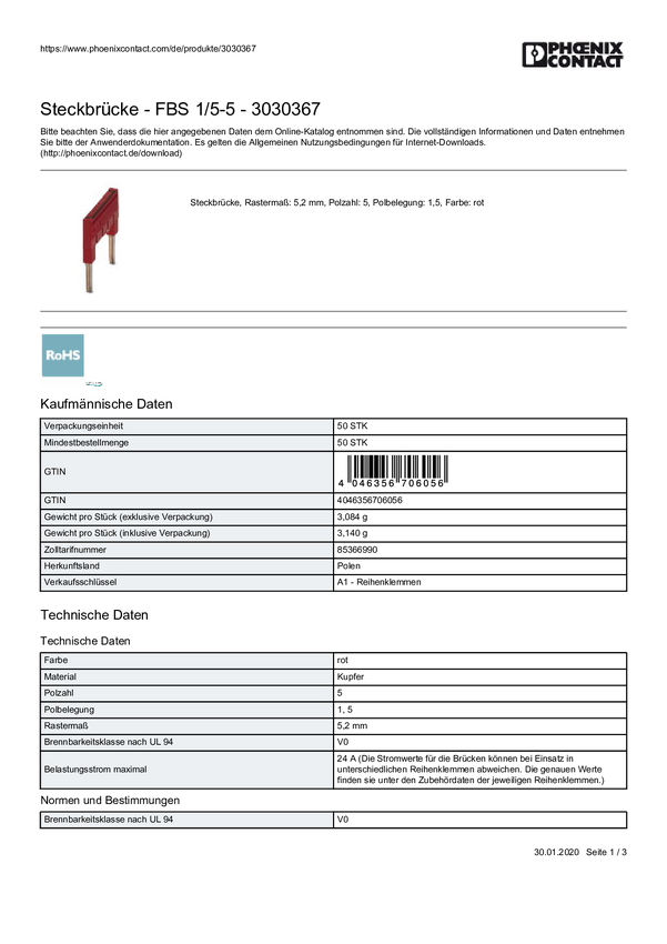 Mostek wtykany Phoenix Contact FBS 1/5-5 3030367, 50 szt.