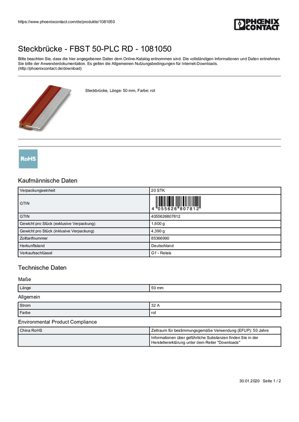 Phoenix Contact 1081050 Mostek wtykany czerwony 20 szt.