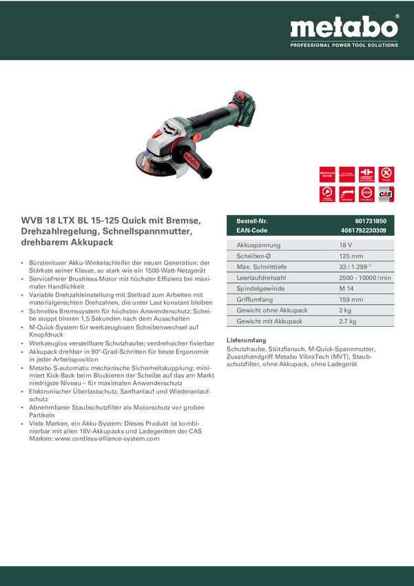 Akumulatorowa szlifierka kątowa Metabo WVB 18 LTX BL 15-125 Quick 601731660