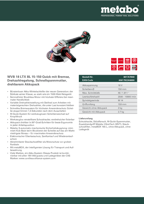 Akumulatorowa szlifierka kątowa Metabo WVB 18 LTX BL 15-150 Quick 601747840