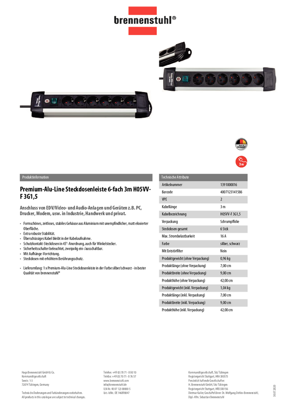 Brennenstuhl 1391000016 Listwa zasilająca z wyłącznikiem 6 x czarny, aluminiowy złącze bezpieczne 1 szt.